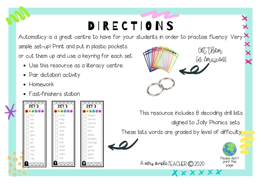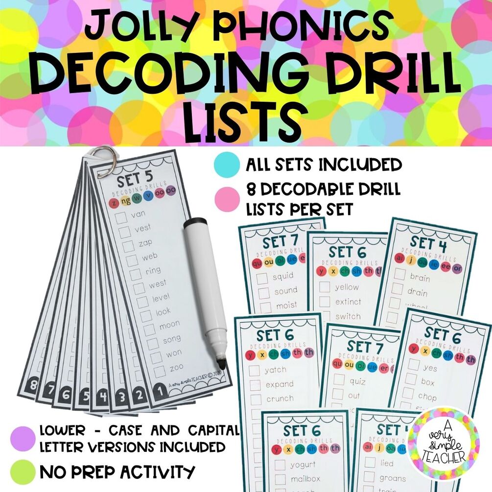These phonics based decoding activities are perfect for students who are learning to read and write various phonics patterns. Inlcudes 8 decoding drilling lists per Jolly Phonics set. These phonics decodables are designed to move students from slowly blending words to a level where decoding is habitual and automatic.